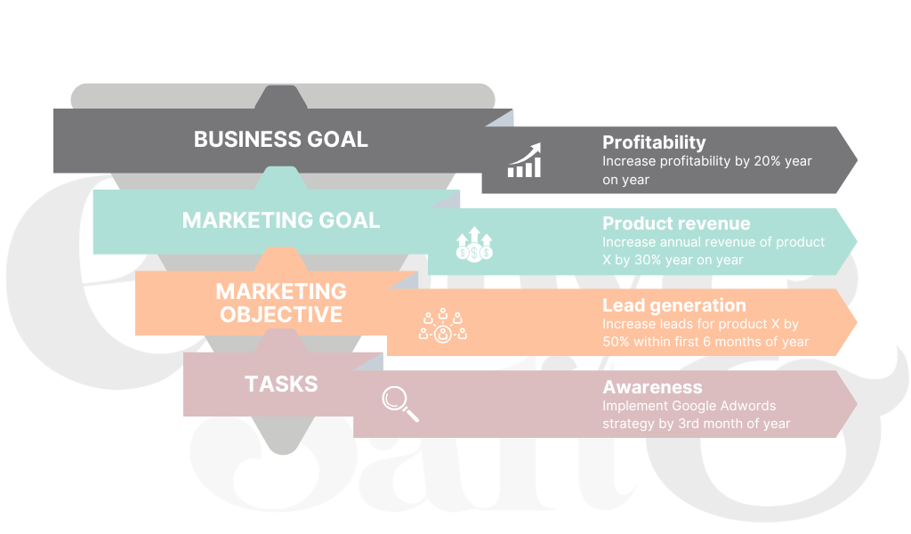 Marketing objectives are the measurable outcomes that tell you if your marketing strategy has been a success. An example could be increasing your website traffic by 20% over 12 months. Each objective plays a part in helping you arrive at your marketing goal, which in turn should contribute towards the company achieving its overall business goal.
